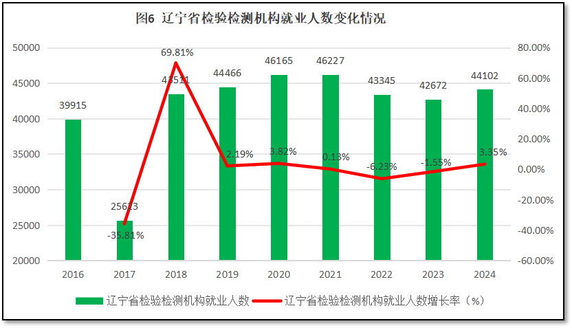 由图6可见,除了2017年辽宁省检验检测机构从业人员数据较为异常之外,其余年份辽宁省检验检测机构从业人数从2016年的4万人左右缓慢增加到2021年的4.6万人,之后又逐步下降到4.3万人左右,波动幅度不大。2024年末,辽宁省检验检测机构从业人员为4.41万人,较2023年出现小幅回升。从增长率曲线看,除了因为2017年数据偏差导致数据起伏较大之外,从2019年之后辽宁省检验检测机构从业人数增长率曲线比较平坦,年均增长率为0.28%,2024年度同比增幅为3.35%。